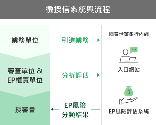 本行依循赤道原則規範調整銀行徵授信流程,一旦客戶提出專案融資需求,將由EP權責單位根據金額及其他相關資訊判斷案件是否適用赤道原則。若判斷為適用,則由營業單位請客戶提供獨立第三方之環境與社會風險評估相關文件,將環境與社會風險因子納入案件徵信調查內容,由EP權責單位進行環境與社會風險分析,同時透過本行赤道原則風險評估系統決定案件分級,並擬定環境與社會風險審查意見報告,提交授信審查單位進行決策。