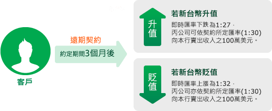 為客戶規避匯率風險之工具。客戶與本行在約定的日期,以特定的價格,購買或賣出一定金額之外匯合約。遠期匯率是以即期匯率做基礎,透過利率差額調整所得到的未來天期匯率。