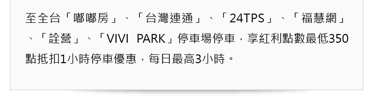 於「福慧網」台中(含)以南之停車場停車,享紅利點數350點抵扣1小時停車優惠;其餘停車場均享550點抵扣1小時優惠。
