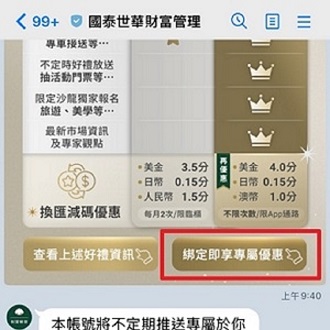 - 活動對象: 成功綁定「國泰世華銀行」LINE個人化服務及加入「國泰世華財富管理」LINE好友之客戶。