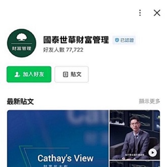 加入「國泰世華財富管理」LINE好友,方便您即時獲取專業市場報告、達人聊投資,輕鬆查看每日市場脈動與即時焦點指數、優惠活動等更多專屬權益。