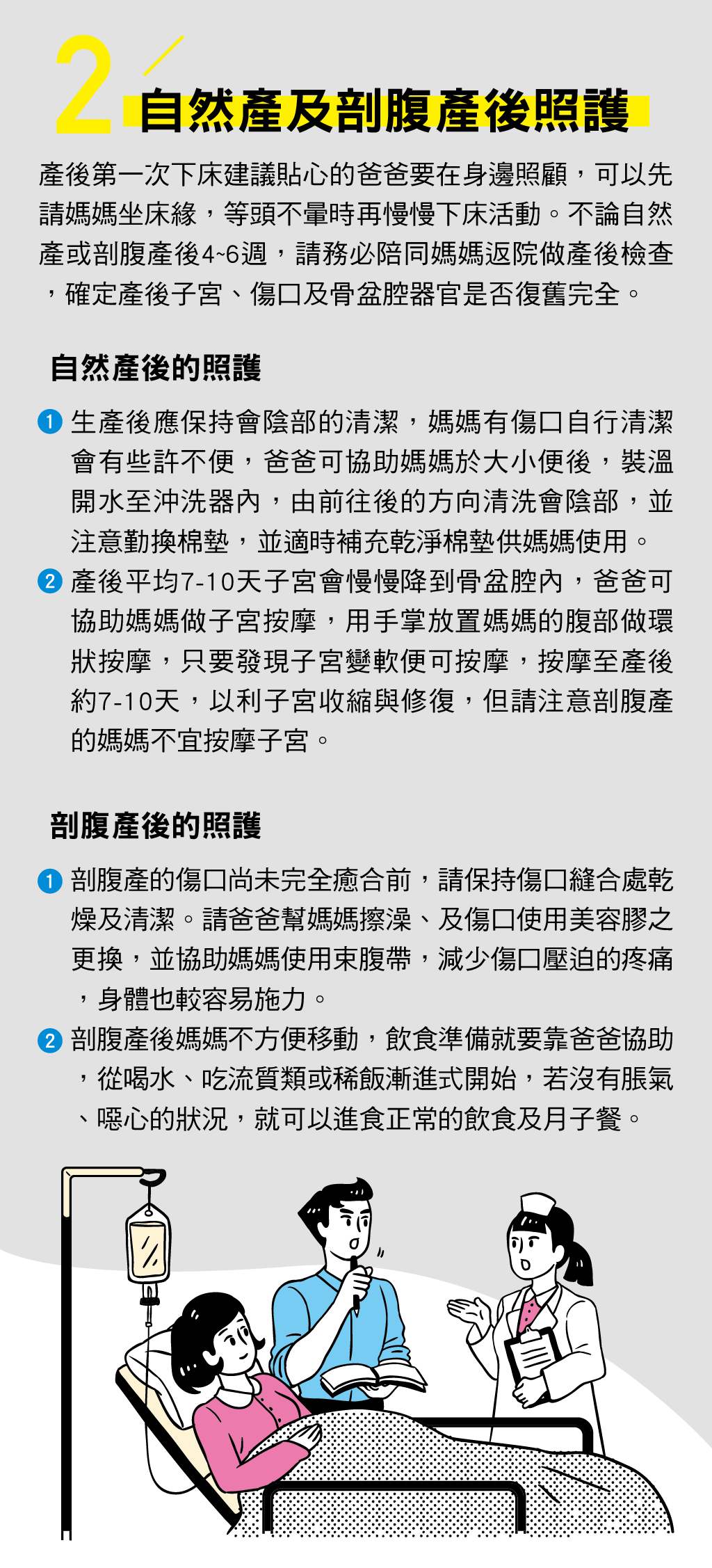 產後第一次下床建議貼心的爸爸要在身邊照顧,可以先請媽媽坐床緣,等頭不暈時再慢慢下床活動。不論自然產或剖腹產後4~6 週,請務必陪同媽媽返院做產後檢查,確定產後子宮、傷口及骨盆腔器官是否復舊完全。自然產後的照護生產後應保持會陰部的清潔,媽媽有傷口自行清潔會有些許不便,爸爸可協助媽媽於大小便後,裝溫開水至沖洗器內,由前往後的方向清洗會陰部,並注意勤換棉墊,並適時補充乾淨棉墊供媽媽使用。產後平均7-10天子宮會慢慢降到骨盆腔內,爸爸可協助媽媽做子宮按摩,用手掌放置媽媽的腹部做環狀按摩,只要發現子宮變軟便可按摩,按摩至產後約7-10天,以利子宮收縮與修復,但請注意剖腹產的媽媽不宜按摩子宮。剖腹產後的照護剖腹產的傷口尚未完全癒合前,請保持傷口縫合處乾燥及清潔。請爸爸幫媽媽擦澡、及傷口使用美容膠之更換,並協助媽媽使用束腹帶,減少傷口壓迫的疼痛,身體也較容易施力。剖腹產後媽媽不方便移動,飲食準備就要靠爸爸協助,從喝水、吃流質類或稀飯漸進式開始,若沒有脹氣、噁心的狀況,就可以進食正常的飲食及月子餐。