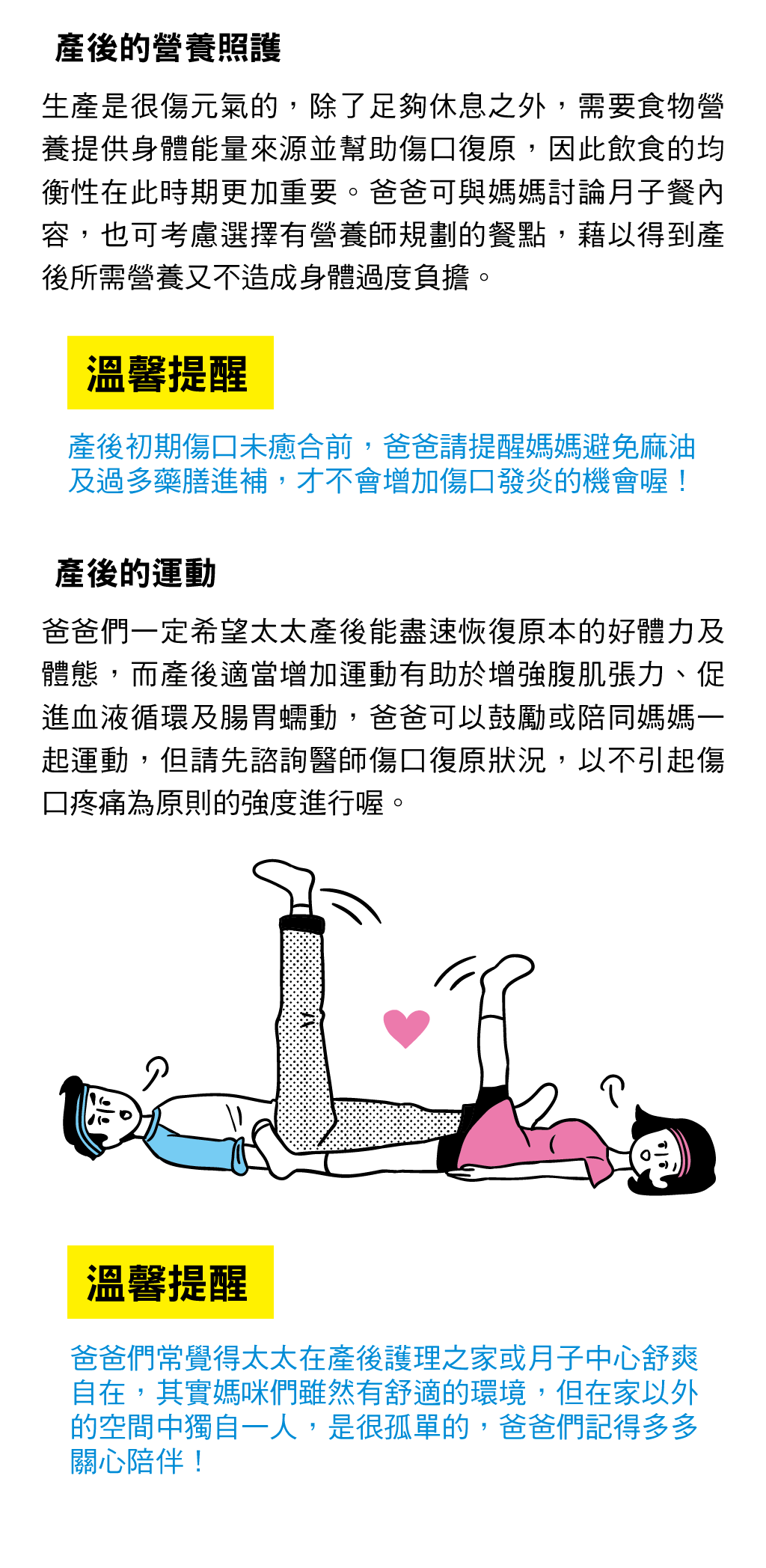 生產是很傷元氣的,除了足夠休息之外,需要食物營養提供身體能量來源並幫助傷口復原,因此飲食的均衡性在此時期更加重要。爸爸可與媽媽討論月子餐內容,也可考慮選擇有營養師規劃的餐點,藉以得到產後所需營養又不造成身體過度負擔。溫馨提醒爸爸們常覺得太太在產後護理之家或月子中心舒爽自在,其實媽咪們雖然有舒適的環境,但在家以外的空間中獨自一人,是很孤單的,爸爸們記得多多關心陪伴!產後的運動爸爸們一定希望太太產後能盡速恢復原本的好體力及體態,而產後適當增加運動有助於增強腹肌張力、促進血液循環及腸胃蠕動,爸爸可以鼓勵或陪同媽媽一起運動,但請先諮詢醫師傷口復原狀況,以不引起傷口疼痛為原則的強度進行喔。溫馨提醒爸爸們常覺得太太在產後護理之家或月子中心舒爽自在,其實媽咪們雖然有舒適的環境,但在家以外的空間中獨自一人,是很孤單的,爸爸們記得多多關心陪伴!