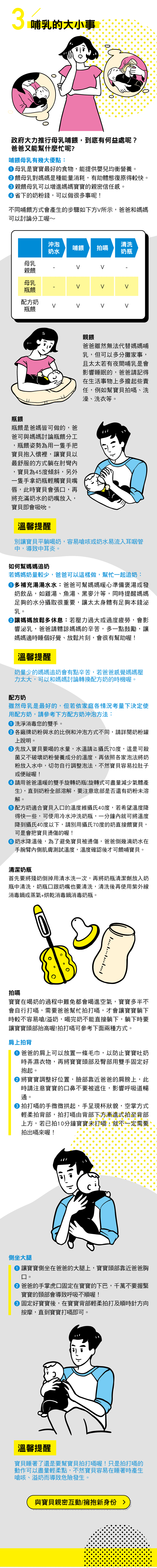 親餵-爸爸雖然無法代替媽媽哺乳,但可以多分攤家事,且太太若有夜間哺乳是會影響睡眠的,爸爸請記得在生活事物上多擔起些責任,例如幫寶貝拍嗝、洗澡、洗衣等。瓶餵-瓶餵是爸媽皆可做的,爸爸可與媽媽討論瓶餵分工,瓶餵姿勢為用一隻手把寶貝抱入懷裡,讓寶貝以最舒服的方式躺在肘彎內,寶貝為45度傾斜,另外一隻手拿奶瓶輕觸寶貝嘴唇,此時寶貝會張口,再將充滿奶水的奶嘴放入,寶貝即會吸吮。