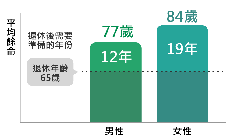 ● 女性比男性多活7年:根據內政部公布數據,台灣女性平均壽命達84歲(男性77歲)。需要更長時間的資金,支持退休生活和長期的醫療費用。